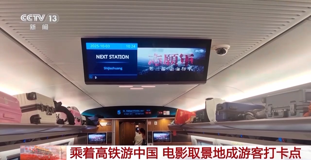 据了解,为持续推动“电影+”业态创新,国庆期间,在全国3000多个铁路客运车站、4200多组动车组列车的车厢电视上,集中播放《跟着电影去旅游》等影旅主题推介视频,不仅展示热门电影取景地,还联动多条铁路旅游专线提供出行指引,邀请旅客体验“铁路+电影”的出行新方式。