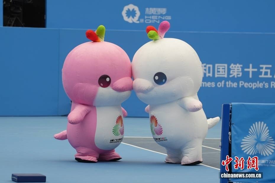 11月15日,第十五届全国运动会网球项目在广东珠海横琴国际网球中心进行,吉祥物“喜洋洋”和“乐融融”亮相现场。中新社记者 杨华峰 摄