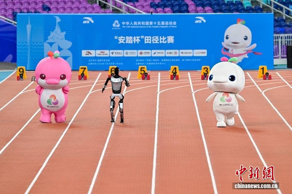 11月17日,第十五届全国运动会田径项目多项赛事在广东省奥体中心体育场举行。女子100米复赛开赛前,吉祥物“喜洋洋”“乐融融”与机器人为观众上演了一场百米赛道趣味竞速赛。中新社记者 陈骥旻 摄