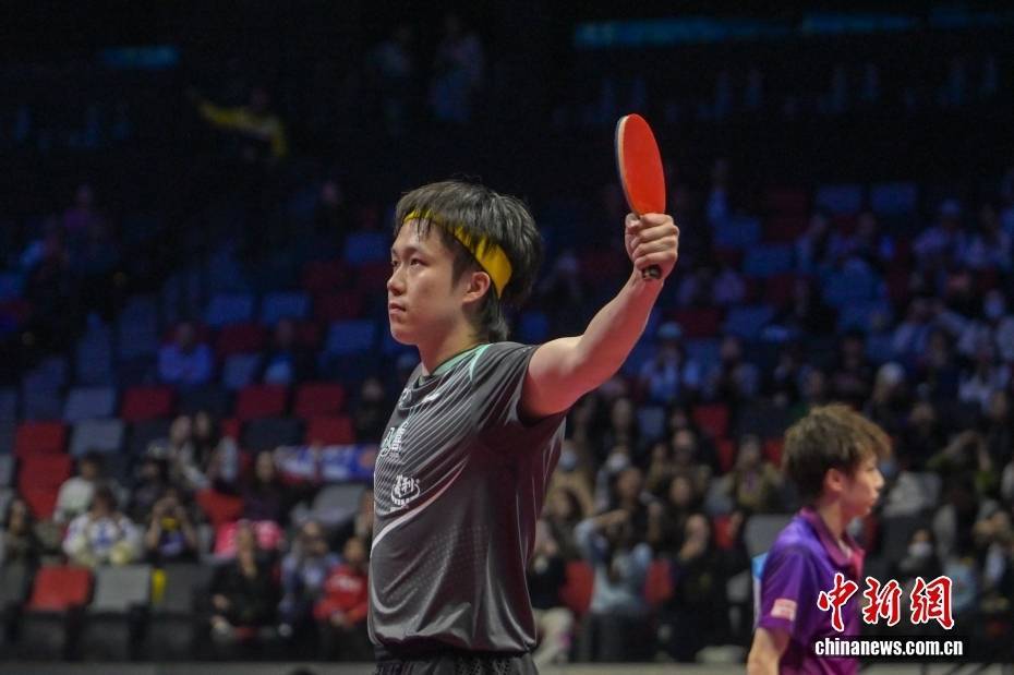 11月13日,第十五届全国运动会乒乓球成年组男子单打1/4决赛在澳门银河综艺馆举行。在当日的一场比赛中,北京队选手王楚钦以4:2战胜广东队选手林高远,晋级四强。图为王楚钦(左)在比赛中庆祝。中新社记者 陈永诺 摄