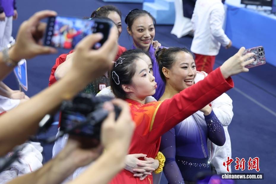 11月16日,第十五届全国运动会体操项目女子跳马决赛在广东肇庆举行,江西队邓娅兰夺冠。图为邓娅兰(右一)在比赛后和参赛选手合影。中新社记者 盛佳鹏 摄