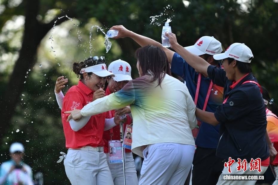 11月16日,在香港举行的第十五届全国运动会高尔夫球女子个人赛中,广东队选手张维维获得冠军。图为张维维与团队庆祝获胜。中新社记者 李志华 摄