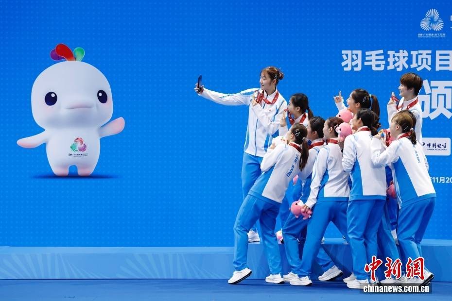 11月14日,第十五届全国运动会羽毛球成年组女子团体决赛在深圳市体育中心体育馆进行,浙江队以3比0战胜江苏队夺冠。图为浙江队在颁奖仪式上合影。中新社记者 韩海丹 摄