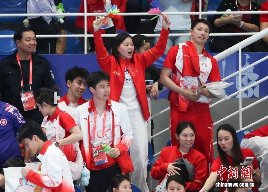 11月10日,在广东省奥体中心游泳跳水馆举行的第十五届全国运动会跳水项目女子10米跳台决赛中,上海队陈芋汐夺得金牌。图为陈芋汐夺金时,全红婵在看台席为她庆祝。中新社记者 陈楚红 摄