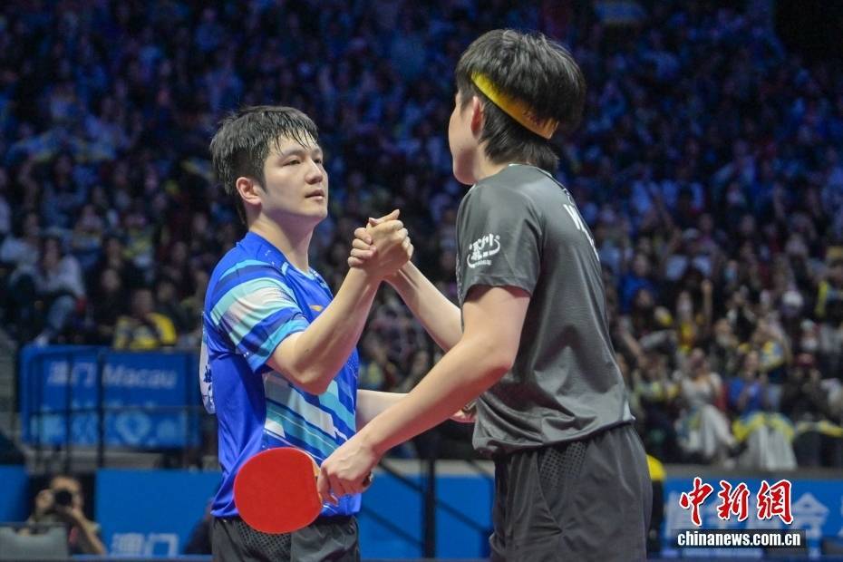 11月15日,第十五届全国运动会乒乓球成年组男子单打半决赛在澳门银河综艺馆举行。上海队选手樊振东以4:2战胜北京队选手王楚钦,成功晋级。图为樊振东(左)与王楚钦握手。中新社记者 陈永诺 摄