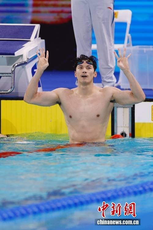 11月17日,在深圳大运中心游泳馆举行的第十五届全国运动会游泳项目男子400米个人混合泳决赛中,汪顺夺得金牌。这是汪顺在本届全运会上夺得的第4枚金牌。他以总数19枚金牌创造全运会历史上金牌总数之最。图为汪顺庆祝四届全运会包揽男子200米混合泳和400米混合泳的全部8枚金牌。中新社记者 韩海丹 摄
