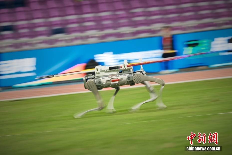 11月16日,第十五届全国运动会田径男子十项全能在广东省奥体中心体育场进行,赛场上运送标枪的机器狗引人关注。